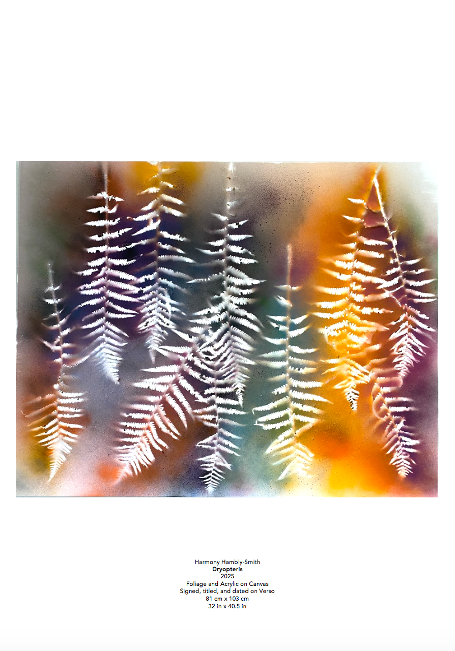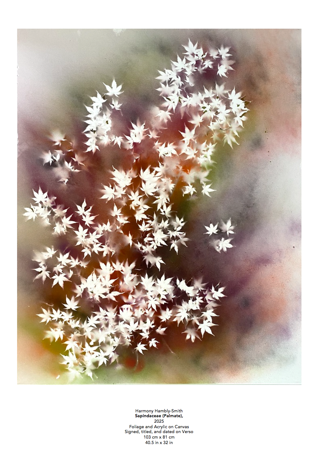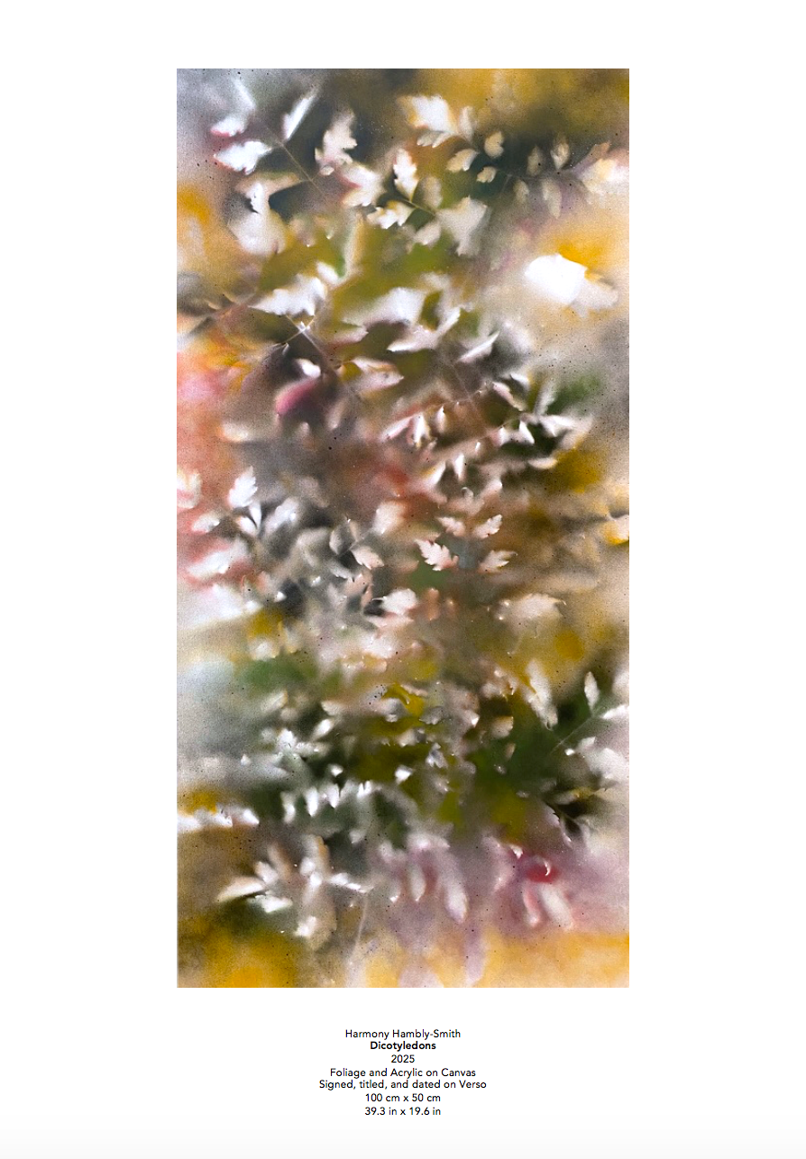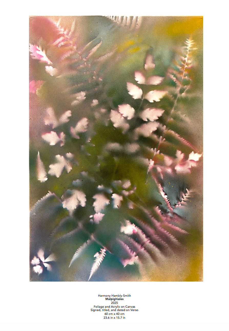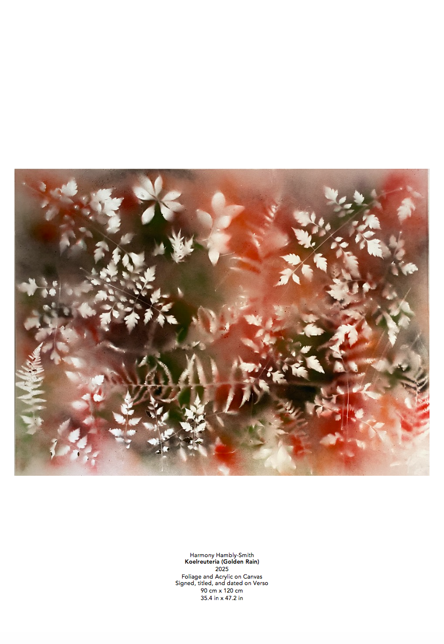 Through compositions that combine paint with gathered plant life, she invites the elements themselves to participate. Leaves, branches, and petals are arranged upon the canvas. over time, weather and light intervene, leaving spectral imprints as pigments react to the forces of nature. The resulting silhouettes, at once delicate and indelible, commemorate cycles of growth, decay, and renewal, preserving fleeting moments much like fossils or memento mori.