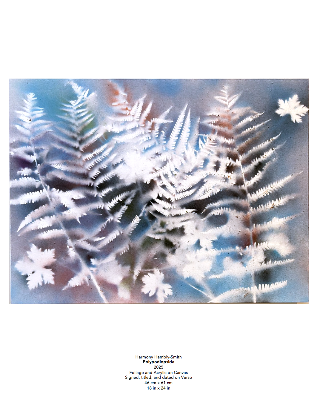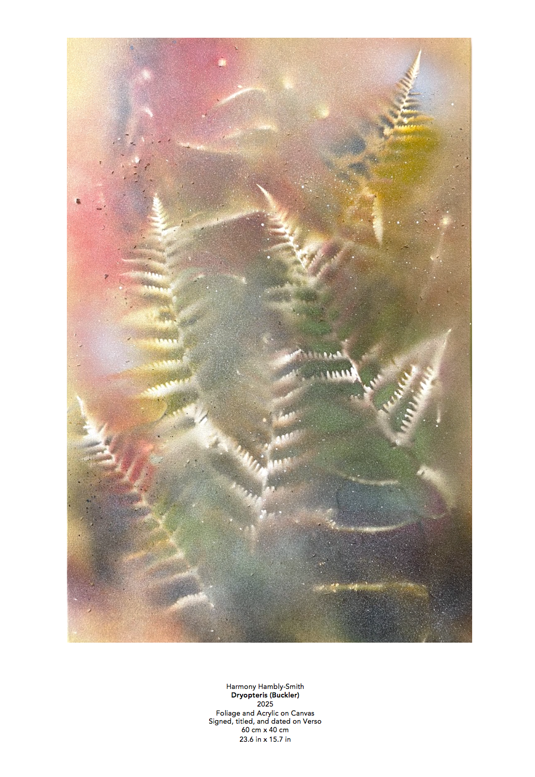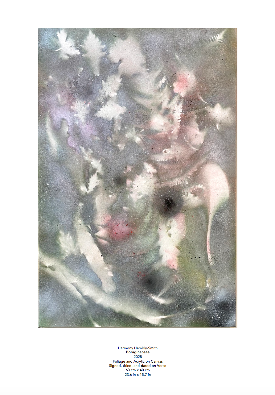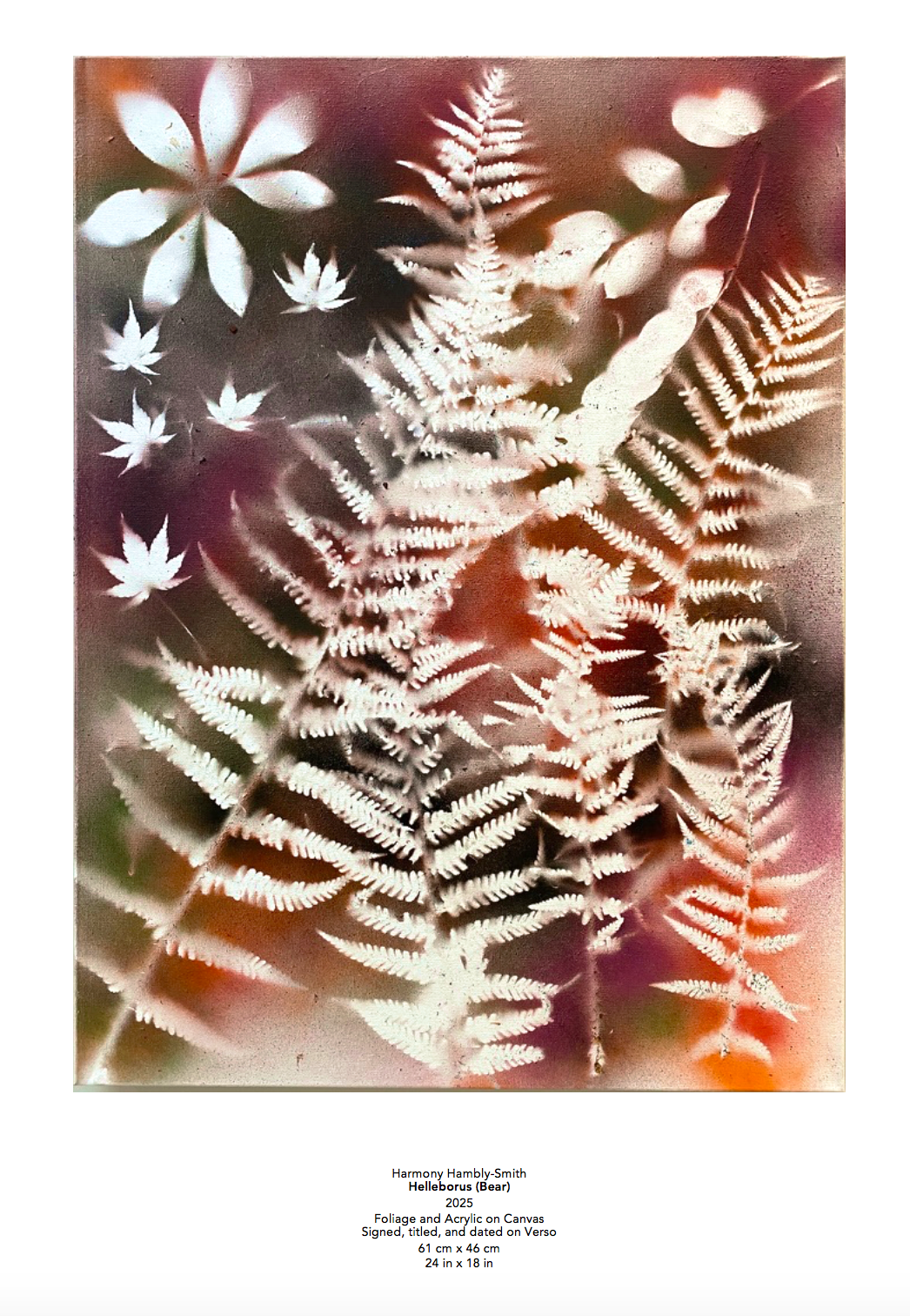 Through compositions that combine paint with gathered plant life, she invites the elements themselves to participate. Leaves, branches, and petals are arranged upon the canvas. over time, weather and light intervene, leaving spectral imprints as pigments react to the forces of nature. The resulting silhouettes, at once delicate and indelible, commemorate cycles of growth, decay, and renewal, preserving fleeting moments much like fossils or memento mori.